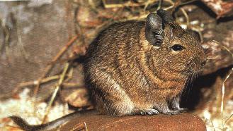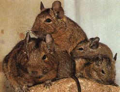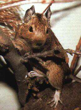 | Was ist ein Degu? | Degus sind, wie man auf dem Bild oben erkennen kann, kleine putzige Nagetiere. Mit Schwanz sind sie ca. 20cm groß und haben ein bräunliches Fell. Artverwandt sind sie mit den Meerschweinchen. Degus sind aber, im Vergleich zu ihren Verwandten, tag- und nachtaktiv. Es kommt darauf an wie man sich mit ihnen abgibt. So kann es schon vorkommen, daß auch nachts gearbeitet wird. |